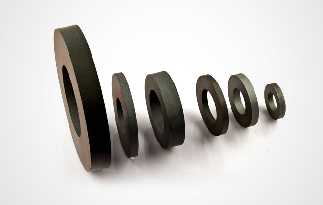 鐵氧體磁鐵主要是以SrO以及Fe2O3為主要原料,通過陶瓷燒結(jié)工藝制作而成。該種磁鐵防腐性能很好,不必進行表面電鍍處理。產(chǎn)品形狀可以制作成圓環(huán)形、圓柱形、方塊形和瓦片形。